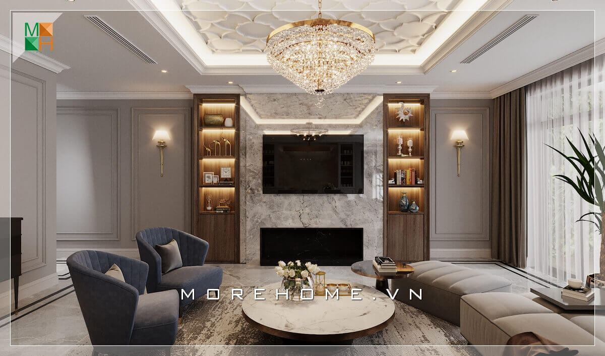 Mẫu thiết phòng khách mang phong cách có chút pha lẫn tân cổ điển và hiện đại của nội thất căn hộ tạo nên một không gian phòng khách đẹp, sang trọng.