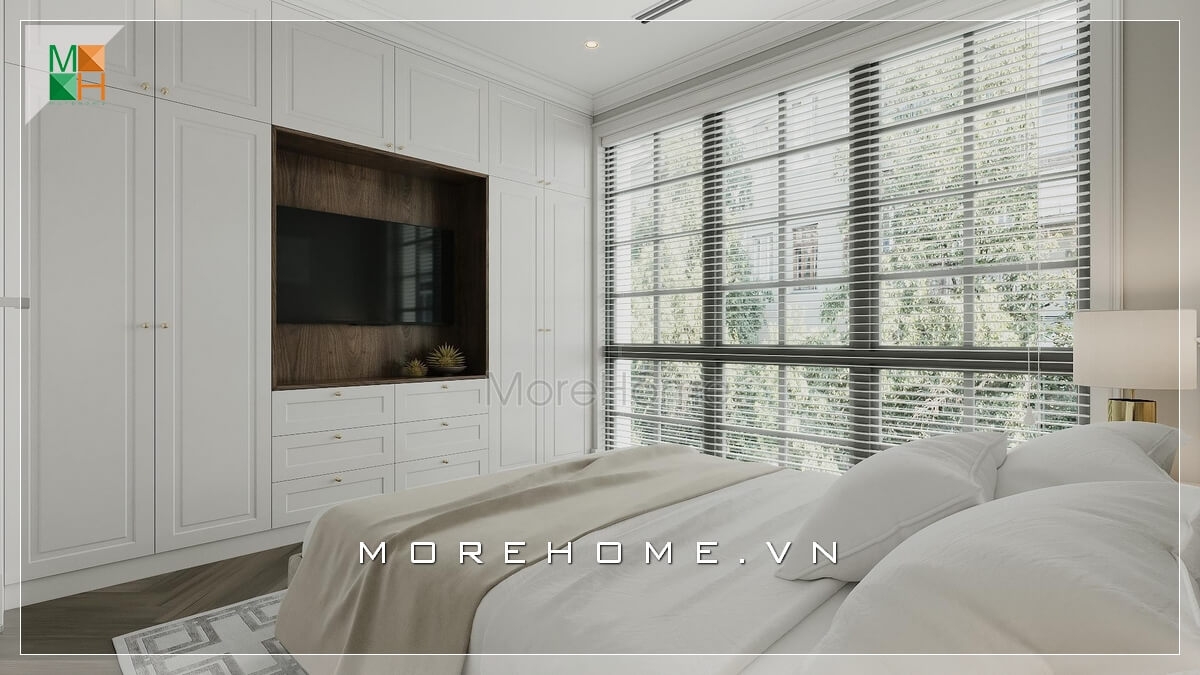 Phòng ngủ hiện đại được thiết kế với màu trắng tinh tế nhẹ nhàng cùng với việc bố trí vách kính đón ánh sáng trực tiếp đem đến những cảm giác thích thú, thoải mái cho những phút giây thư giãn.