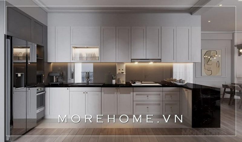 Mẫu tủ bếp gỗ màu trắng hiện đại, mặt bếp ốp đá đen cao cấp, tạo nên không gian sạch sẽ và điểm nhấn tinh tế cho ngôi nhà