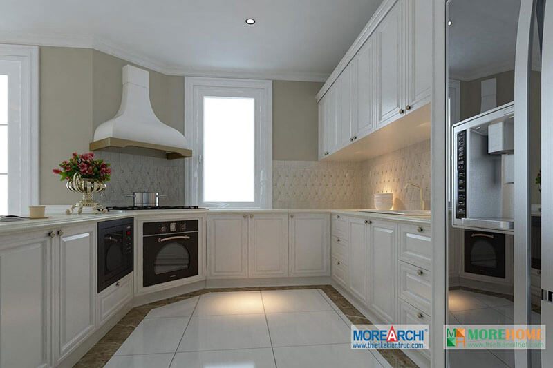 Mẫu tủ bếp gỗ tự nhiên được thiết kế tân cổ điển màu trắng sang trọng tạo không gian phòng bếp rộng và tiện nghi