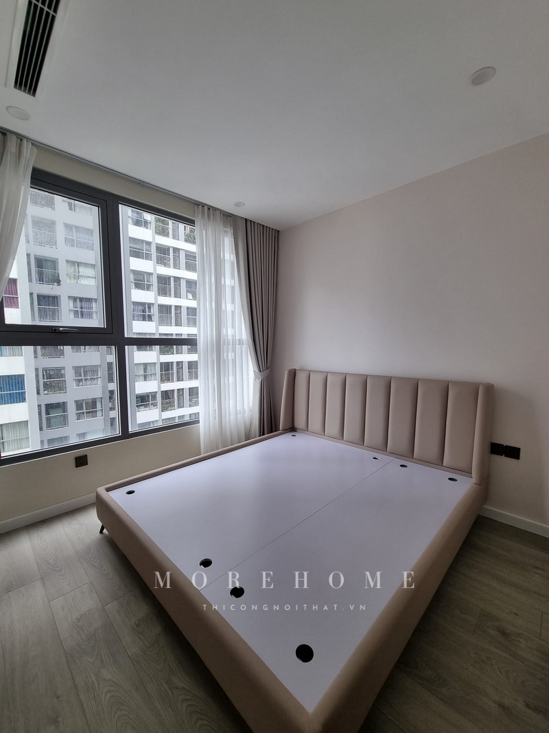 Thi công giường ngủ bọc da màu be hiện đại kiểu dáng đơn giản nhưng không kém phần sang trọng.