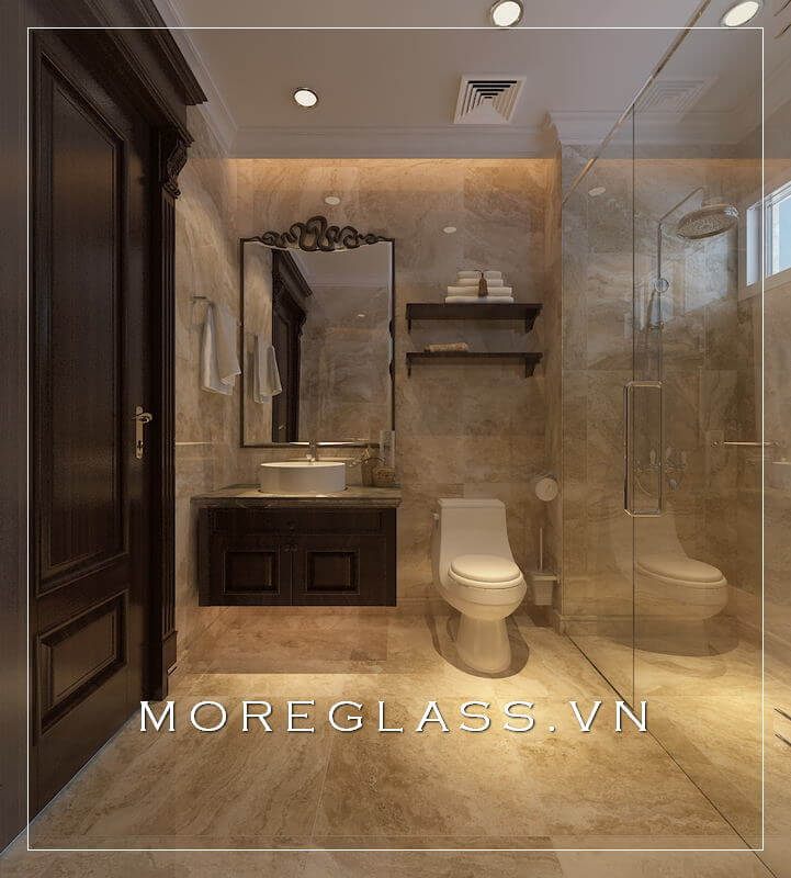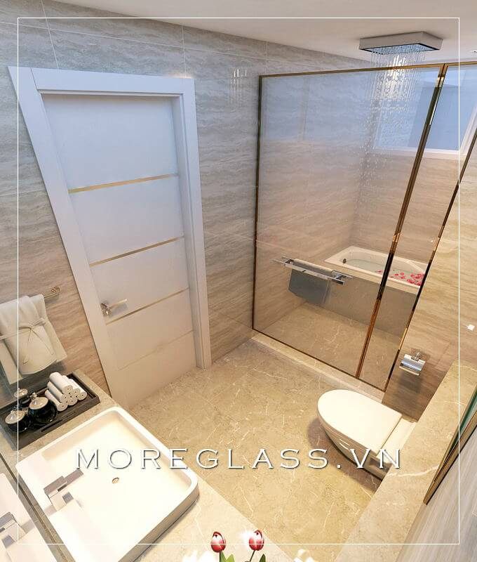 Vách tắm kính 90 độ được sử dụng để phân cách 2 không gian khô và ướt, tránh sự ảnh hưởng của chúng lên nhau.