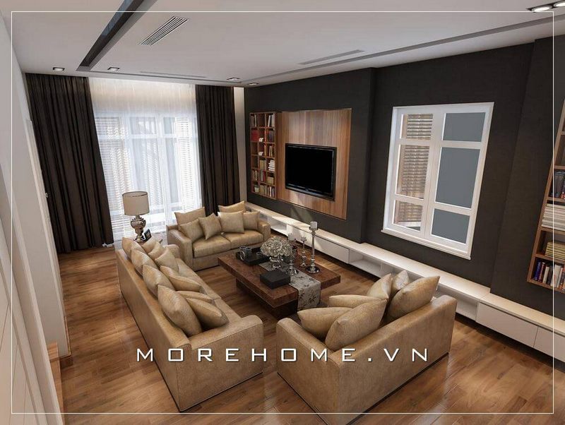 Mẫu thiết kế nội thất phòng khách nhà phố đẹp với bộ sofa bọc và các kệ ti vi, kệ trang trí ốp sát tường giúp giảm thiểu diện tích không gian căn phòng.