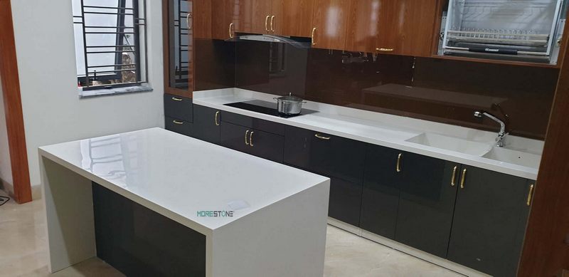 . Màu trắng làm chủ đạo cùng với đường vân mây ấn tượng, đá ốp bếp nhân tạo giúp tạo ra một không gian nhà bếp hiện đại, sang trọng và sạch sẽ hơn.