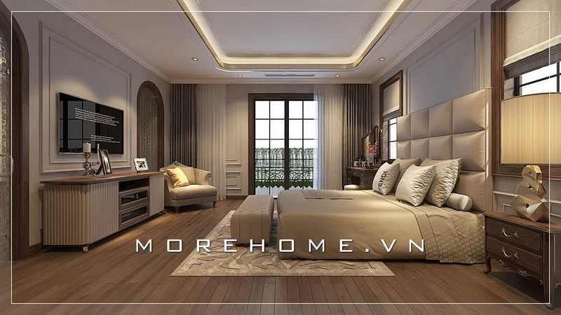 Phòng ngủ master được trang bị nội thất có phong cách tân cổ điển với những hoa văn đặc trưng và màu sắc độc đáo.